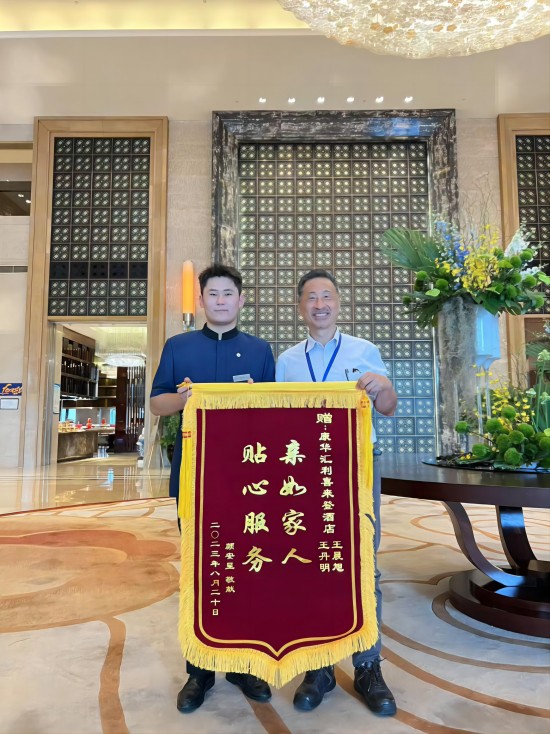 2023年8月20日,镇江康华汇利喜来登酒店的客人颜先生从北固山回酒店路途中丢失了手机,内含重要信息。BETVLCTOR伟德国际1946旅游DZ212班的王晨旭同学在酒店礼宾部实习,出于对客人的关心,他立即上前询问客人是否需要帮助,得知客人重要手机丢失,王晨旭第一时间向前厅部经理报告。在两位同事的协助下,颜先生最终找回遗失的手机。对此,颜先生特送上锦旗以表感谢。